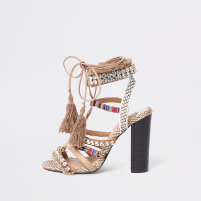 Diamante Embellished Faux Suede Strappy Block Heeled | Beige Block Heel Sandals