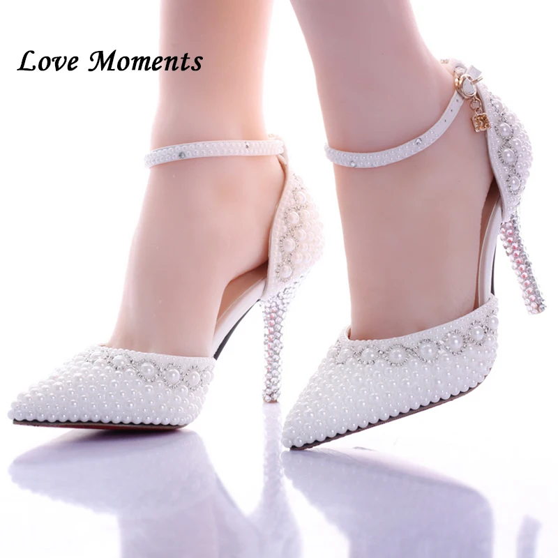Love Moments Pointed Toe White Pearl Rhinestone Wedding | Pearl Heels